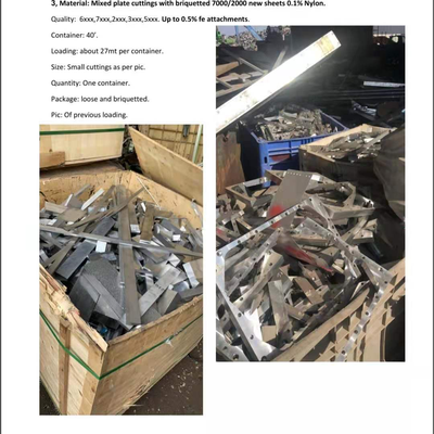 7000/2000新板材的混合板材切割余料。0.1% 尼龙。质量: 6x, 7x, 2x, 3x, 5x. 不超过0.5%的铁。数量: 一个40尺集装箱约27吨包装:散装或压块 货源地:以色列