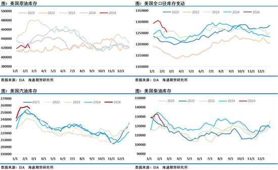 EIA在其最新一期《每周石油状况报告》中指出,截至2月13日当周,美国商业原油库存(不包括战略石油储备SPR)较前一周减少900万桶。包括原油、车用汽油、燃料乙醇、煤油型航空燃料、馏分燃料油(3495-7.00-0.20%)、残渣燃料油、丙烷/丙烯及其他油品在内的石油总库存为16.70亿桶。总库存环比大幅下降1,890万桶,同比增加6,290万桶。原油及汽柴油库存降幅均远超预期,汽柴油消费均表现尚可,整体数据明显好于预期,有助于缓解供应过剩担忧,这进一步给油价带来支撑。