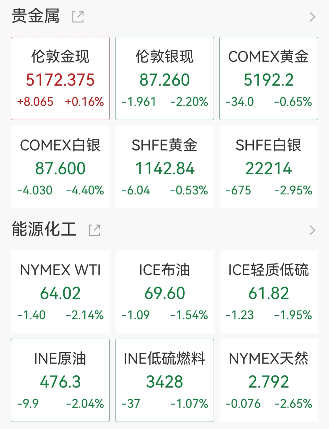 2月26日,国际银价大幅跳水,COMEX白银(89.031.441.65%)期货一度大跌超5%,现货白银一度大跌逾3%,黄金价(5188.14-6.06-0.12%)格亦持续回落。国际原油(65.14-0.06-0.10%)价格也大跳水,WTI原油日内大跌2.14%,现报64美元/桶;布伦特原油日内跌1.54%,报69.6美元/桶。