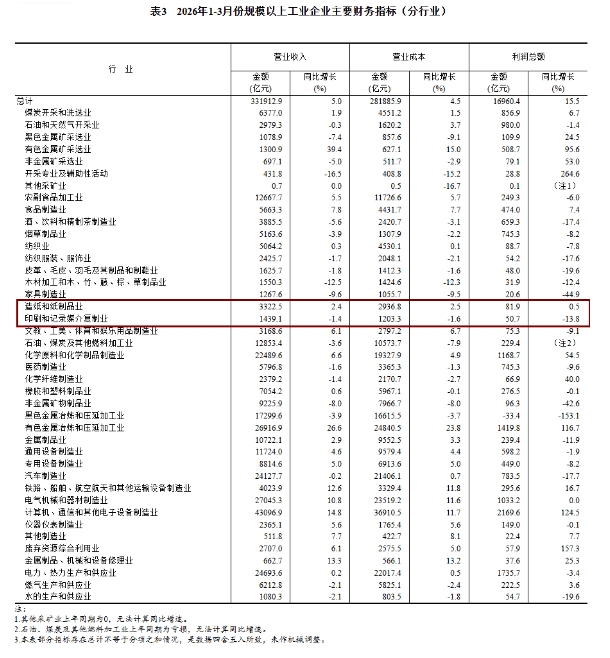 2026年1—3月份印刷和记录媒介复制业实现营业收入1439.1亿元,同比下降1.4%;实现利润总额50.7亿元,同比下降13.8%。