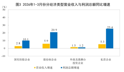 1—3月份,规模以上工业企业中,国有控股企业实现利润总额6196.1亿元,同比增长10.1%;股份制企业实现利润总额13054.6亿元,增长20.9%;外商及港澳台投资企业实现利润总额3837.3亿元,增长1.2%;私营企业实现利润总额4305.3亿元,增长25.4%。