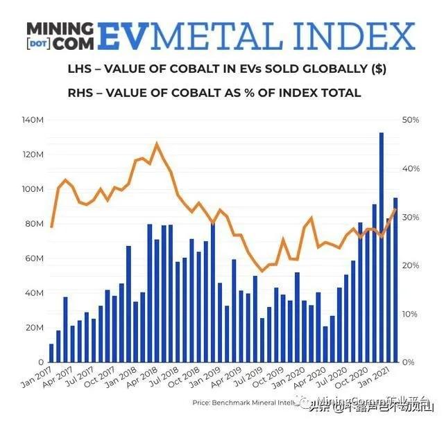 根据基准2月份的价格评估,钴的份额也正在攀升,超过30%,这要归功于最昂贵的正极材料从2019年12月的每吨30,000美元的低点大幅上涨至每吨65,000美元以上。