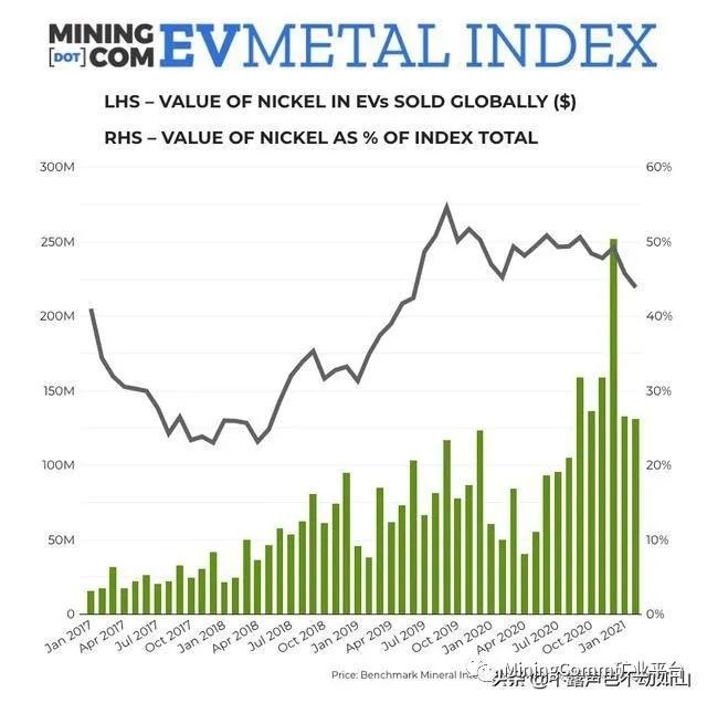 阿达玛斯说,由于使用高镍含量电池的高性能全电动汽车,如特斯拉Model 3和Y,福特野马Mach-E,全球每辆车(包括混合动力车)钴和镍的加权平均重量同比增长了两位数。奥迪e-tron Quattro的销售强劲。