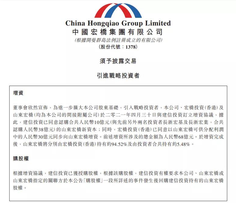 公告称,为进一步扩大公司股东基础,引入战略投资者,山东宏桥及其母公司宏桥投资(香港)(两者均为中国宏桥的间接附属公司)与建信投资近日达成增资协议,建信投资已同意认购山东宏桥10亿元股份,加上之前另外两名投资者长浙宏基及长浙宏叶,三家合共认购38亿元山东宏桥新资本;同时,宏桥投资(香港)同意以山东宏桥可供分配利润中的30亿元同步向山东宏桥增资,相当于分红转股本。截至公告日,以上增资已全部完成。