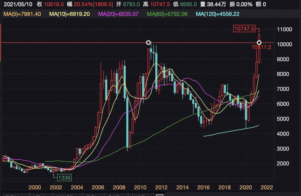 另一备受关注的品种是铜。5月10日,铜价再创历史新高,截至北京时间20:14,伦铜报10613美元/吨,突破了2011年时的高位。
