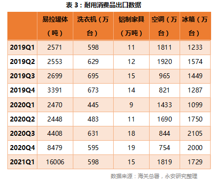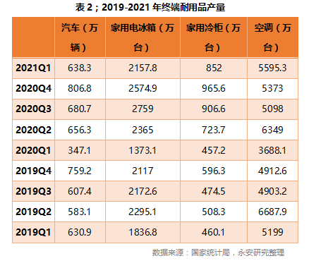 从终端产成品数据来看,一季度国内汽车产量638万辆,较2020年同期增长83.9%,但与2019年同期631万辆相比,差别并不明显;家用电冰箱和冷柜产量为3010万台,较2020年同比增长64.5%,较2019年同比增长31%;家用空调产量为5595万台,较2020年同比增长51.7%,较2019年同比增长7.6%。