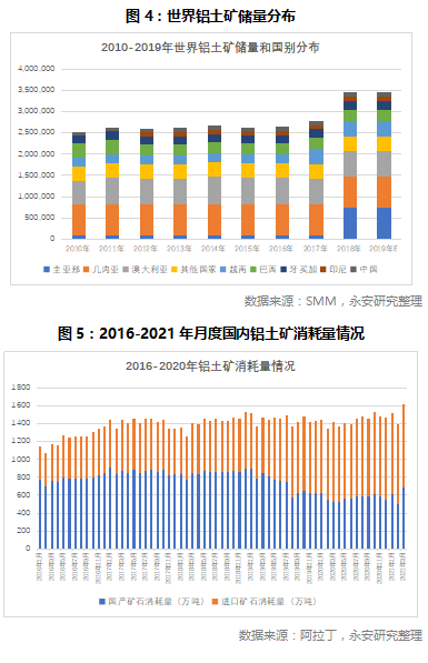 铝土矿供给方面,最新数据世界铝土矿储量360.9亿吨,中国铝土矿储量10亿吨,占比2.79%,保持稳定;消耗量来看,国内近年来以进口矿为主,国产矿为辅;2020年国内铝土矿消耗量约1.72亿吨,其中进口铝土矿消耗1.04亿吨,占比60%。