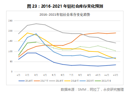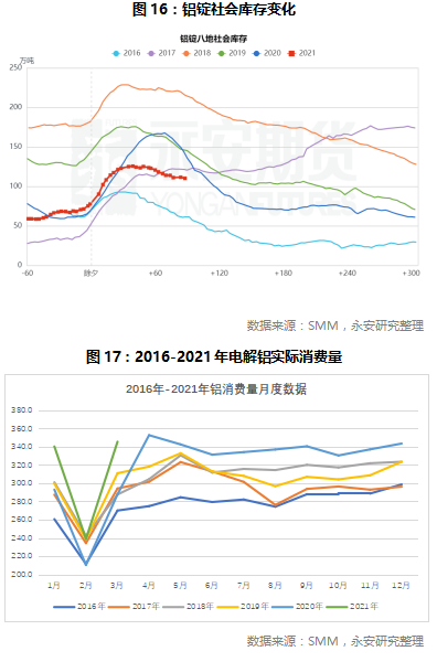 在预测全年增速方面,我们参考了往年增速情况。2020年全年铝的实际消费量由于疫情影响呈现前低后高的特征,以往铝的消费高峰基本在5月,而2020年由于疫情影响,二、三月的铝消费量被递延到了四月,我们假设2021年铝的消费量延续2019年的消费特征。2020年电解铝实际消费量较2019年同比增长4.7%,2021年一季度铝消费量较2019年增长9%,年化复合增长为4.4%,所以我们认为2021年全年4.5%的增速是合理的预测,全年铝实际消费量将达到4000万吨,缺口为10万吨,四、五月是电解铝消耗高峰。从目前实际的去库趋势来看,和我们预测的去库速度基本一致。