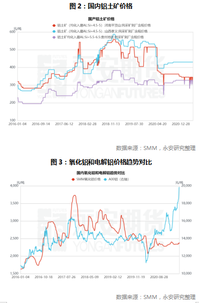 从如上资料可知,矿端目前呈现如下几大特点:1)铝土矿全球储量巨大,国内自采量稳定;2)进口铝土矿来源国较多,且海外项目中资投入多;因此目前进口铝土矿买方市场定价,价格波动主要受海运费影响。