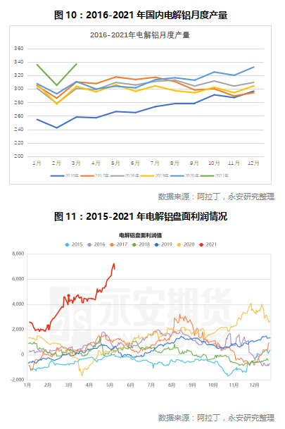 国内电解铝月产量自去年8月以来已持续新高。数据显示,2021年一季度国内电解铝产量达到978.6万吨,同比增长7.35%;日均产量接近11万吨。同时,由于铝价上涨,电解铝的生产利润已经超过6000元/吨,意味着电解铝厂目前具有极高的生产积极性。