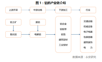 作为期货主力品种的电解铝,在整个铝的产业链中处于中游冶炼环节,其上游是铝土矿开采和氧化铝制成,下游是铝材加工,终端则是如电缆铝箔、铝合金门窗、电冰箱、铝罐等终端产品。