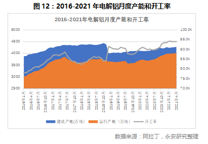 产能方面,截至4月底,国内电解铝建成产能4269万吨,运行产能4000万吨,开工率为93.71%。趋势来看,2020年10月以来,国内电解铝开工率始终保持在93%以上,重点生产地区如山东、新疆、内蒙古、云南等地开工率达到96%以上,接近满产。高开工率意味着企业除增加新项目投产外很难通过原有项目释放更多产能。