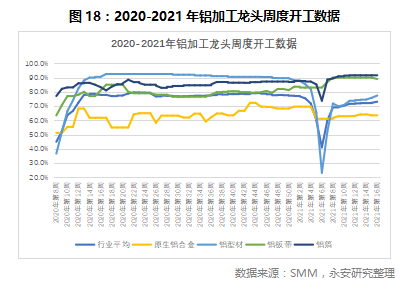 虽然铝价高企,但下游铝材开工率依旧旺盛。数据显示,一季度国内铝材产量达到1388.7万吨,同比增长31.1%;重点铝加工板块龙头企业的开工率数据来看,行业平均开工率稳步回升,铝板带、铝箔企业的开工率始终处于年度高位,基本满产;铝型材企业从年后开始稳步回升中,铝合金型材开工率较低主要因为汽车企业缺芯使得汽车轮毂订单减少所致。