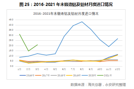 铝材若打开进口套利窗口将放缓价格上涨的速度。在3月23日,铝价因为一则“抛储”的传言,一度临近跌停,全天跌幅达到2.32%;直至今日,“抛储”是否执行未知,但目前看来,国储局的原铝储备在70万吨附近,相比全年接近4000万吨的产量预期,影响很小,并不是决定铝价的关键矛盾点。当时我们指出,“抛储”仅可能平滑铝价的波动,替代原铝进口套利的角色。以2020年6-10月为例,由于国内铝价和国际铝价的价差较大,使得进口套利窗口打开,三季度铝材进口量117万吨,远超往年同期水平,铝价在三季度基本走平。