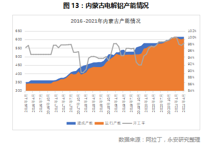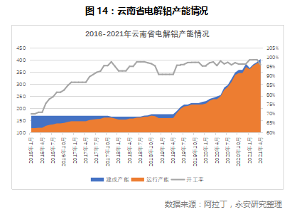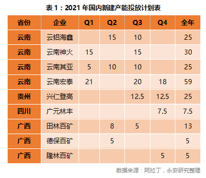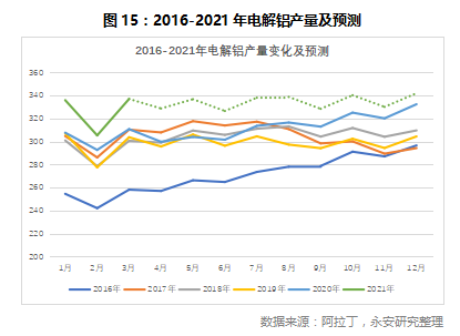 全年国内电解铝产量预计接近4000万吨。在全年产能测算方面,我们假设内蒙的运行产能维持现有状态不变,云南地区新增产能投放计划完成70%,预计全年国内电解铝产量在3990万吨,并有望超过4000万吨,同比2020年增长6.7%。