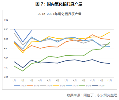 氧化铝供给方面,2017年以来,氧化铝年度平均产量在7000万吨左右,并未有明显变化;2021年一季度,随着国内电解铝产量的提升,氧化铝月产量出现历史近5年来新高。1月氧化铝产量达到650万吨,但与2019年1月相比,也并未有大幅提升。