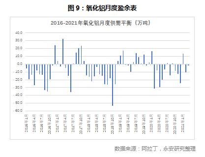 因此,结合国内电解铝和氧化铝的产量及两者间的转换关系(每吨电解铝一般需要1.92吨氧化铝),国内氧化铝在2020年处于净消耗状态,在2021年一季度则处于紧平衡状态。
