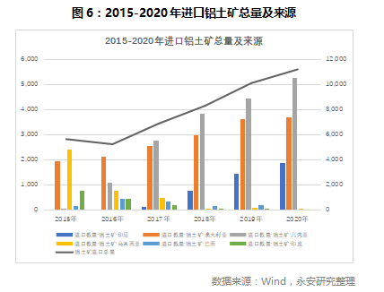 进口铝土矿的占比方面,几内亚近年来已经超过印尼和澳洲成为第一大进口来源国,2020年国内从几内亚进口铝土矿5267万吨,占进口矿比重达到47%。此外,几内亚的铝土矿项目以中铝、魏桥等国内铝业巨头和几内亚政府联合开发,几内亚博法铝土矿项目保有可开发资源量约17.5亿吨,可持续开发60年。