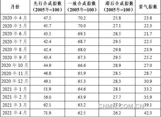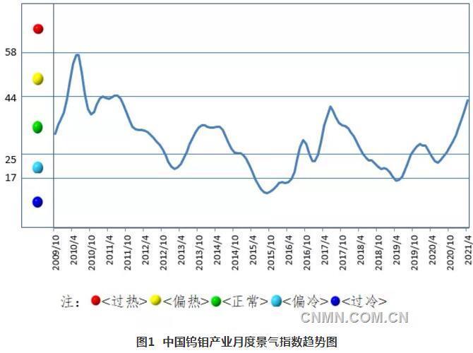 中国钨钼产业月度景气指数监测结果显示,2021年4月,中国钨钼产业景气指数为42.3,连续10个月持续回升,在“正常”区间运行;先行合成指数为71.9,持续上涨。近13个月以来中国钨钼产业月度景气指数见表1。