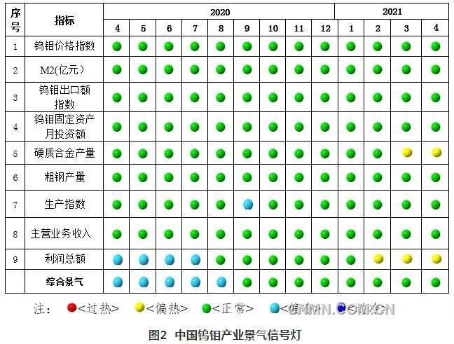 由中国钨钼产业月度景气信号灯(见图2)可见,2021年4月,在构成钨钼产业景气指数的指标中,钨钼价格指数、M2、钨钼出口额指数、钨钼固定资产月投资额、粗钢产量、生产指数及钨钼企业主营业务收入等7个指标处于“正常”区间,硬质合金产量、钨钼企业利润总额等2个指标处于“偏热”区间。值得注意的是,钨钼价格指数持续回升,4月份钨钼价格指数为57.4;钨钼出口额指数持续回升,4月份钨钼出口额指数为16.8;硬质合金产量上涨明显,已进入偏热区间,4月份硬质合金产量指数为166.7;钨钼利润总额指数上涨明显,4月份钨钼利润总额指数为169.2。