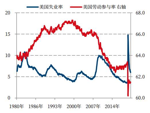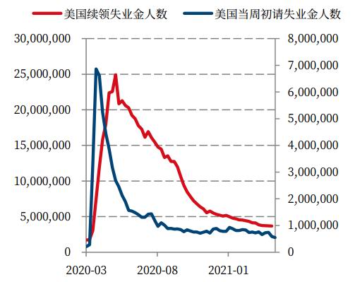 就业方面,美国3月非农就业人数增加91.6万人远超预期,失业率下降至6%与预期持平,其中服务业就业复苏速度较快,显示出疫情对服务业的负面影响正在削弱。随着疫苗接种的全面铺开,服务业就业改善趋势将持续。然而美国劳动参与率仍处于低位,说明就业修复进展仍缓慢。从周频申领失业金人数上来看,以各种形式领取失业补助的人数自1900万高位下降至1700万人附近。当周初请失业金人数连续下降,4月下旬已回落至60万人下方,创去年3月以来新低。美国4月就业修复出现加速迹象,仍需持续关注能否完成美联储主席鲍威尔所述的连续多月新增就业百万的QE缩减条件。