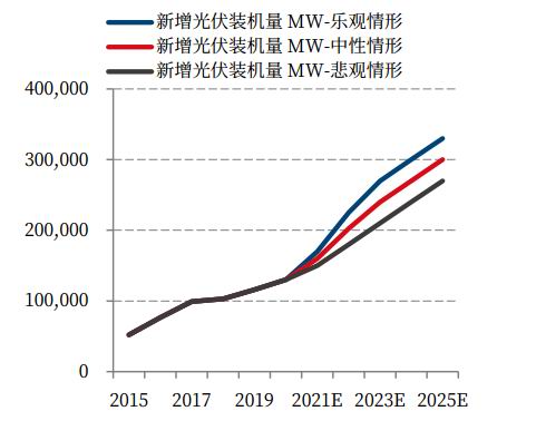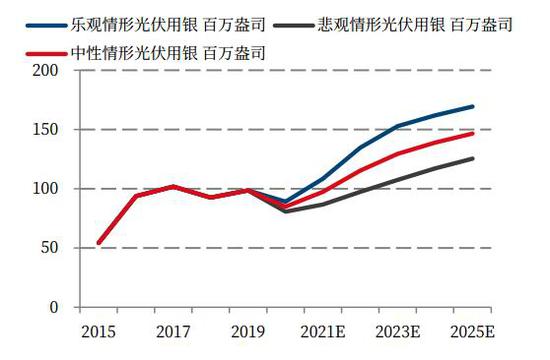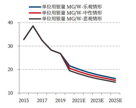 展望未来光伏用银需求,我们通过分析未来光伏电池格局、及单位用银量的变化进行测算。预计到2025年,年光伏用银量在乐观情形下将增加80百万盎司;中性情形下将增加60百万盎司;悲观情形下将增加40百万盎司。虽然随着工艺改善和技术进步单位用银量未来将缩减,但在全球推进碳中和清洁能源发展的大环境下,光伏装机增量将成为光伏用银需求上升的主要驱动力。