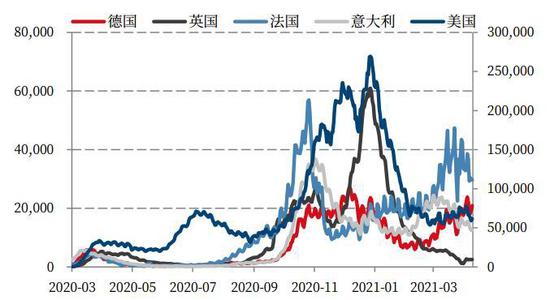 疫情方面,4月美国新冠疫情单日新增确诊人数略有回升但整体相对乐观,法国、德国等欧洲国家新增确诊人数仍处在较高水平。另外近期以印度为首的新兴市场国家的疫情反弹情况值得关注。印度单日新增确诊人数飙升至30万例以上,土耳其和巴西等国仍维持在较高水平。