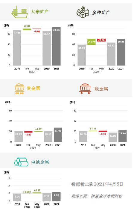 2021年,全球主要矿业项目已经走出了停产风波,同时金属价格的上涨也在刺激矿业投资的支出。标普预计,2021年这些矿业公司的投资总额将达到1760亿美元,较2020年增长18%。
