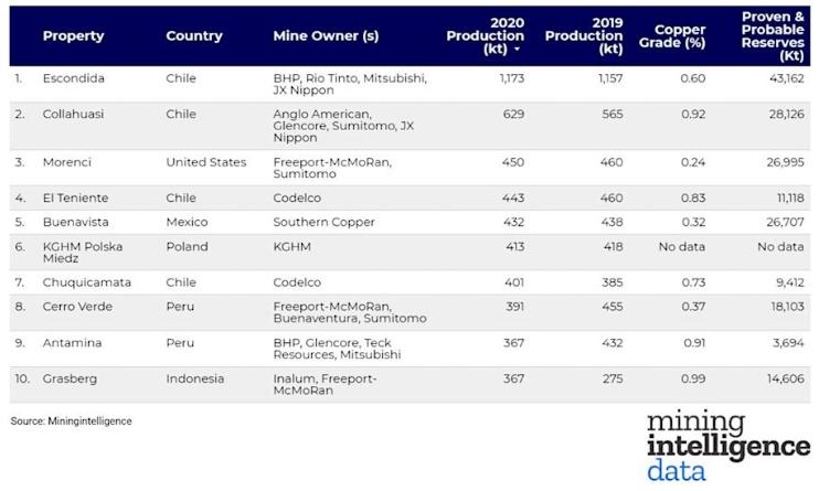 看看卡莫阿-卡库拉在世界十大铜矿中的表现: