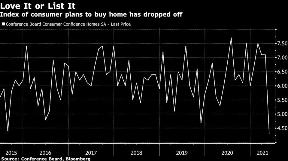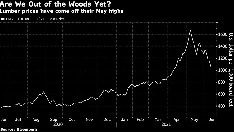 以木材为例,木材是过去一年里上涨幅度最大的大宗商品之一,因为困在家中的美国人将更多资金投入到了生活环境的改造中。然而自5月触及峰值以来,木材价格已经重挫了40%。喧嚣的房地产市场也有所降温,衡量消费者购房计划的指数在上个月出现大跌。此外,铜价也开始从历史高位回落。