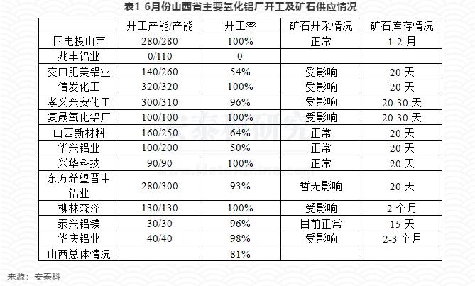 对于山西省氧化铝企业开工情况,安泰科做了最新统计。据统计,当前山西省氧化铝企业共计15家,在产工厂14家,截至六月中旬,全省氧化铝企业开工率达到81%,略低于全国氧化铝企业平均开工水平,其影响因素主要是山西地区氧化铝成本为全国最高。