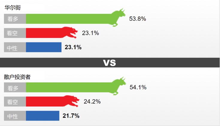 黄金价格调查结果显示,在13位参与调查的华尔街分析师中,53.8%的人看好本周的金价。另外一半的选票在持悲观态度和持中立态度的阵营中平分,每个阵营都获得了23.1%的选票。在散户投资者中也可以看到类似的趋势。839名参与的散户投资者中,54.1%看好本周的价格,24.2%看跌,21.7%持中性态度。