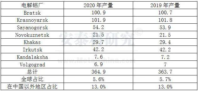 俄罗斯境内有8家电解铝厂,全部归属于俄铝。2020年俄罗斯电解铝产量365万吨,占全球总产量的5.6%,占中国以外地区总产量的13%。