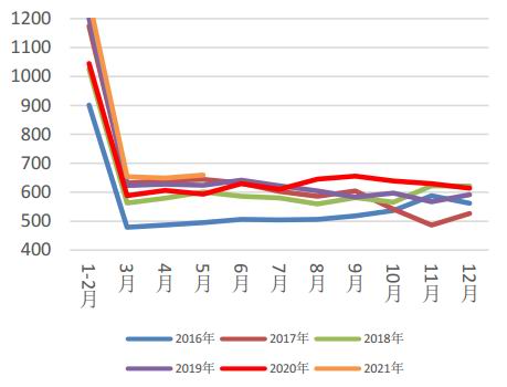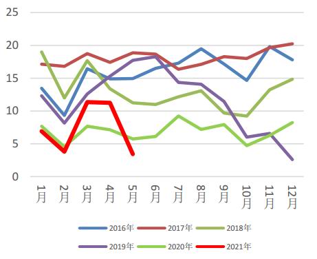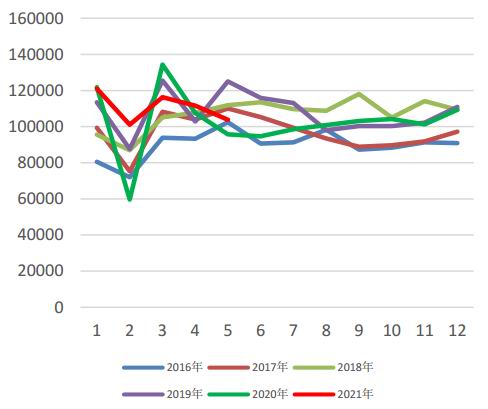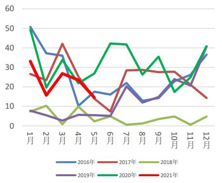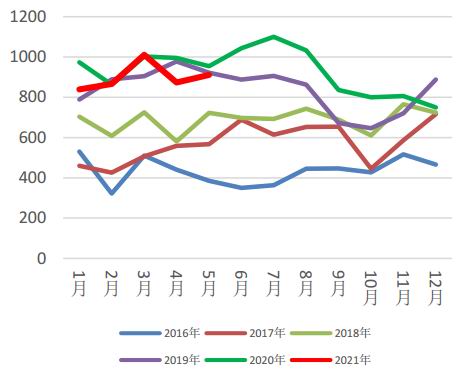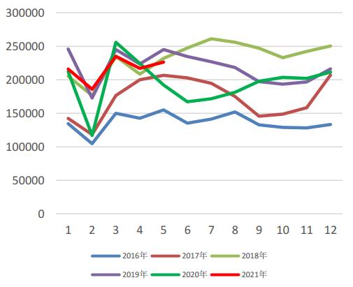 据最新海关数据显示,2021年5月进口废铝3.43万吨,同比减少40.2%,环比减少69.52%。2021年1-5月累积进口36.79万吨,同比增长12.3%。进口废铝数量环比大降,主因广东海关增加了对于废铝检验趋严所致,5月市场反馈广东海关废铝退柜较多,6月海关严苛程度未减,预计6月进口废料总量将仍处于3万吨附近,甚至出现小幅减少。