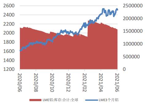 图3 LME3个月铝价(美元/吨)及库存(吨)