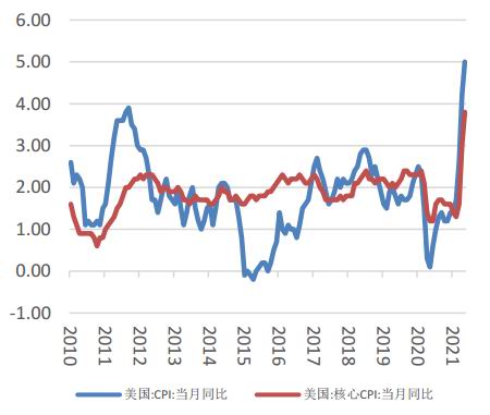 6月10日美国劳工统计局公布了5月CPI数据,同比增长5%继续超出市场平均4.7%的预期,创下了2008年8月通胀5.3%之后的新高;去除食品和能源价格后的核心CPI同比涨幅也达到3.8%,创1992年5月以来的新高。6月25日美国商务部公布的数据显示,美国5月PCE物价指数,也就是个人消费支出物价指数发生“爆表”,远超市场预期,美国5月个人消费支出物价指数同比上升3.9%;美国5月核心个人消费支出物价指数同比上升3.4%,创1991年以来、30年最高。但就业市场来看,美国非农就业数据远超预期。美国劳工部数据显示,6月季调后非农就业人口增85万,预期增70万,前值由增55.9万修正为增58.3万;失业率为5.9%,预期5.7%,前值5.8%;平均时薪环比上升0.3%,预期上升0.4%。高于预期的就业增速表明,美国经济仍有增长势头,但失业率上升显示目前经济尚未完全恢复。