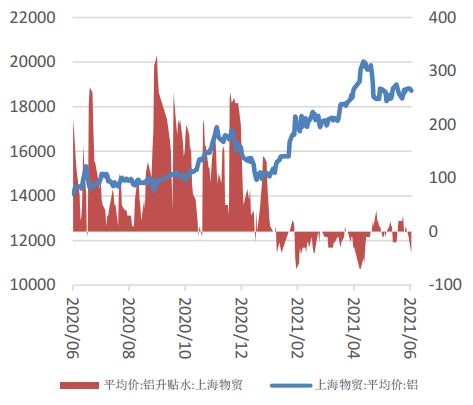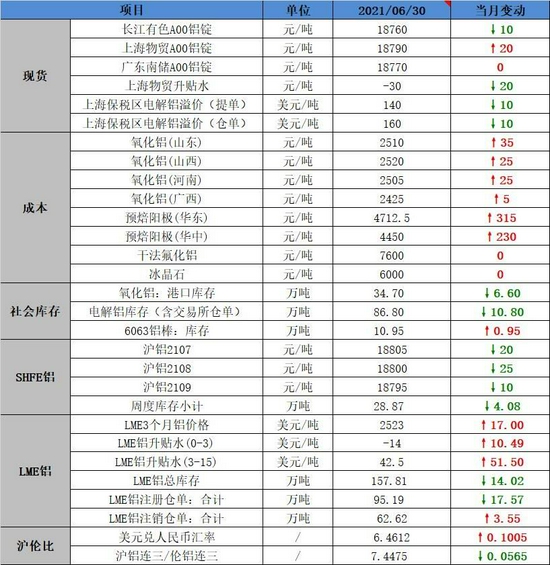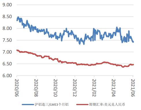 6月份,沪铝2108合约高位整理,月内波动区间不超过1000元/吨,波动性大幅减弱;LME铝价上涨0.68%,连续第五个月上涨;沪伦比6月回落至7.45附近。现货方面,6月份长江有色A00铝锭累计下跌10元/吨,现货处于小幅贴水状态。