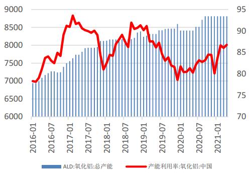 图21 国内电解铝总产能(万吨)及开工率(%)