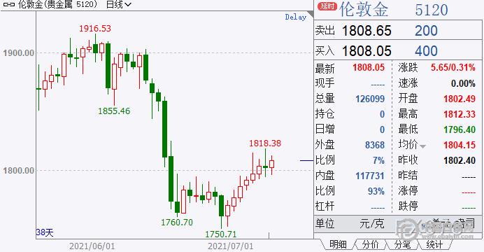 国际金价连续第三周录得阳线,终盘收涨1.22%至1808.05美元/盎司,这也是近七周最大单周涨幅,盘中创6月17日以来新高至1818.38美元/盎司。人们越来越担心Delta变种病毒的蔓延可能会阻碍全球经济复苏。