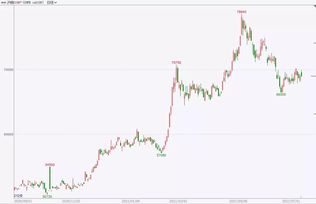 2021年一季度铜价表现强势,价格冲破7万,全球铜价在今年2月触顶回落,3月开始了一轮的震荡调整走势。