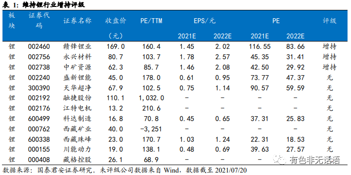 维持锂行业增持评级。基于本轮供需、库存的分析,我们认为本轮锂价上涨的高度、节奏、持续性都将超预期,我们调高下半年锂价预测至历史前高18万/吨。增持:赣锋锂业、中矿资源、永兴材料,受益:江特电机、天齐锂业、盛新锂能、天华超净、融捷股份、科达制造、西藏矿业、西藏珠峰、川能动力、藏格控股。