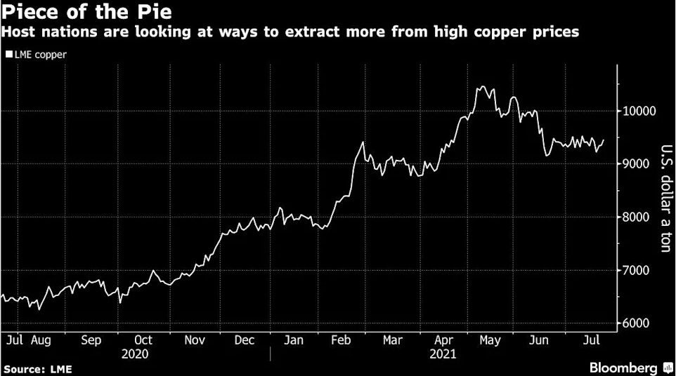 秘鲁新任总统佩德罗·卡斯蒂略(Pedro Castillo)此前曾提议效仿邻国智利,对铜销售征收最多高达75%的重税。智利国会下院在5月则曾批准了一项铜矿特许权使用费法案,将对铜实施浮动征税,当铜价高于4美元/磅时,矿商需缴纳高达75%的边际税率。此外,该新法案还包括对企业税税率的更改,最高可达44%。