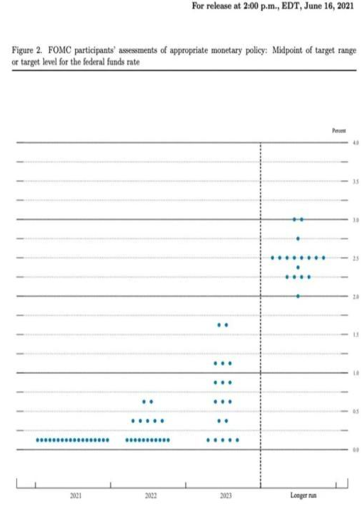 6月17日的议息会上,美联储将基准利率维持在0%-0.25%不变,且维持1200亿美元月度债券购买规模不变。上调美国经济预期,并预计到2023年底将实现两次加息。且将2021年第四季度的通胀率预期调整为3.4%,2022年整体通胀指标预期回落至2.1%,2023年降至2.2%。