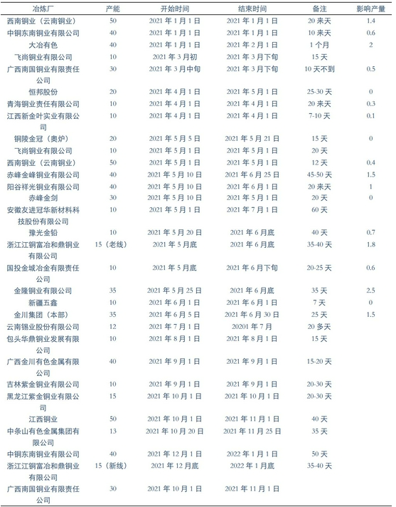 2021年6月中国电解铜产量为82.93万吨,环比降低2.4%,同比增加9.2%。6月份国内冶炼厂依旧处于集中检修期,国内电解铜产量环比持续回落,其中减量主要来自于西南铜业、赤峰金峰以及豫光金铅(600531,股吧),但由于祥光以及金隆产量从检修中恢复,导致环比降幅较小。原料端看,传闻部分冶炼厂在市场上大量采购冷料,外加废铜供应量有所收紧,导致冷料加工费小幅回落但冶炼厂仍有利可图;与此同时,随着海外铜矿新扩建陆续爬产,铜精矿现货TC持续回暖,市场甚至听闻现货铜精矿TC50左右成交,总体来看,矿端及冷料端同步相对宽松下,冶炼厂维持高开工率。从7月份检修计划来看,依然有大量冶炼厂处于检修阶段,但多数冶炼厂冷料备货充足下,预计检修影响量仅有1.8万吨。在TC持续回暖且硫酸价格居高难下的行情下,三季度冶炼厂难改高产量格局。预计7月国内电解铜产量为85.10万吨,环比上升2.6%,同比增加13.5%;至7月份累计电解铜产量为588.85吨,累计同比增长13.6%。
