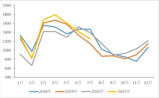 7月份铜消费淡季不淡,主要是因为线缆企业的消费比较好。线缆企业消费从6月份开始好转,7月份得以维持,最主要的原因是价格回落后,企业在3-5月份没有执行的订单开始回补,电网、房地产的订单均有增多。部分企业反映,国家电网招标是以上个月月均价的形式,前期铜价单边上涨的过程中,线缆企业接单的意愿不强。近期铜价开始回落以后,线缆企业开始增加接单量。另外一方面是因为废铜减少,铜价下跌以后,废铜供货商捂货不出,同时马来西亚的疫情加重,市场流通的进口废铜减少,精废价差最小缩窄到300元/吨左右,促进了精铜消费。