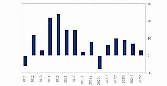惠誉预计,到2021年底,全球精炼锡市场将转为过剩,这种过剩将持续保持到2025年。因此,惠誉预计,未来几年锡价将小幅下跌,至2024年,降到平均每吨2.1万美元的低点。虽然低于2021年的2.8万美元/吨,但仍高于2016年~2020年的平均水平18.729美元/吨。