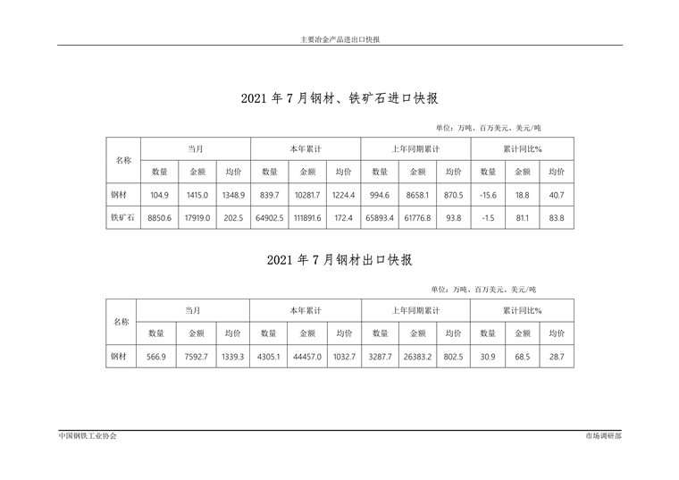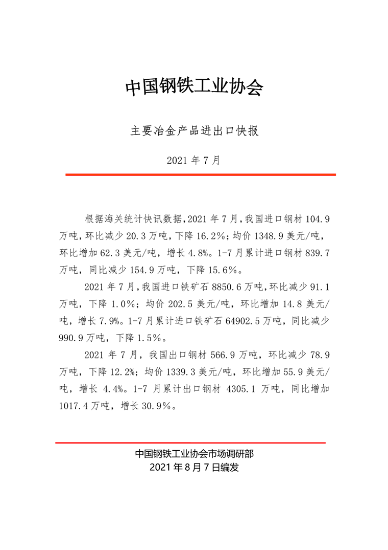 根据海关统计快讯数据,2021年7月,我国进口钢材104.9万吨,环比减少20.3万吨,下降16.2%;均价1348.9美元/吨,环比增加62.3美元/吨,增长4.8%。