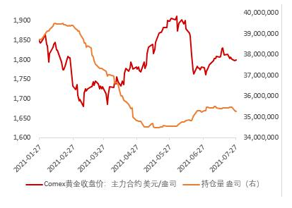 图7:COMEX黄金价格及交易所持仓量