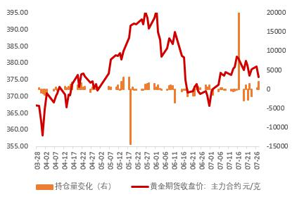 货币市场,7月美元指数在前三周震荡上行,最后一周,呈现单边下跌的趋势,截止7月29日当月美元指数涨幅-0.4%,触及7月12日以来的新低;从7月1日到7月28日,代表实际利率水平的Tips累计下行28BPs,其中代表名义利率的10年期美债收益率贡献了22BPs,通胀预期上升贡献6BPs,通胀预期退潮与名义利率回落共同推动7月实际利率水平的下行,反映了市场对于中长期前景的担忧与通胀交易的回落,对黄金价格形成一定支撑。未来的下半年中,需密切关注美国就业数据的变化,一旦就业数据回升到美联储的预期水平,通胀预期回落合理区间,届时降为美联储提供良好的加息环境,黄金价格或迎来阶段性拐点。
