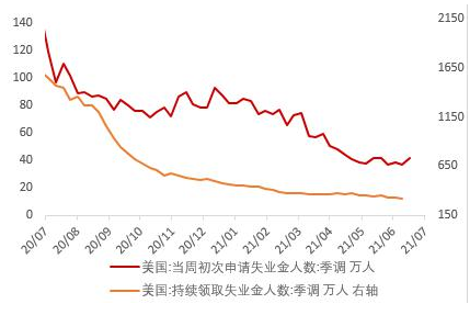 最新数据显示,美国经济数据不及预期。美国二季度GDP折合年率仅增长6.5%,远不及市场预期值8.4%,第一季度数据则被小幅下修至6.3%。表明美国经济虽已一定程度摆脱新冠疫情束缚,但距离完全复苏仍有距离。美国第二季度核心PCE物价指数上升6.1%,创1983年第三季度以来新高。美国上周初请失业金人数为40万人,降至接近疫情期最低水平,预估为38.5万人,前值修正为42.4万人。